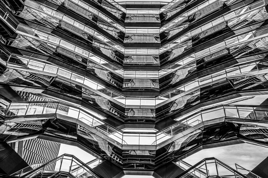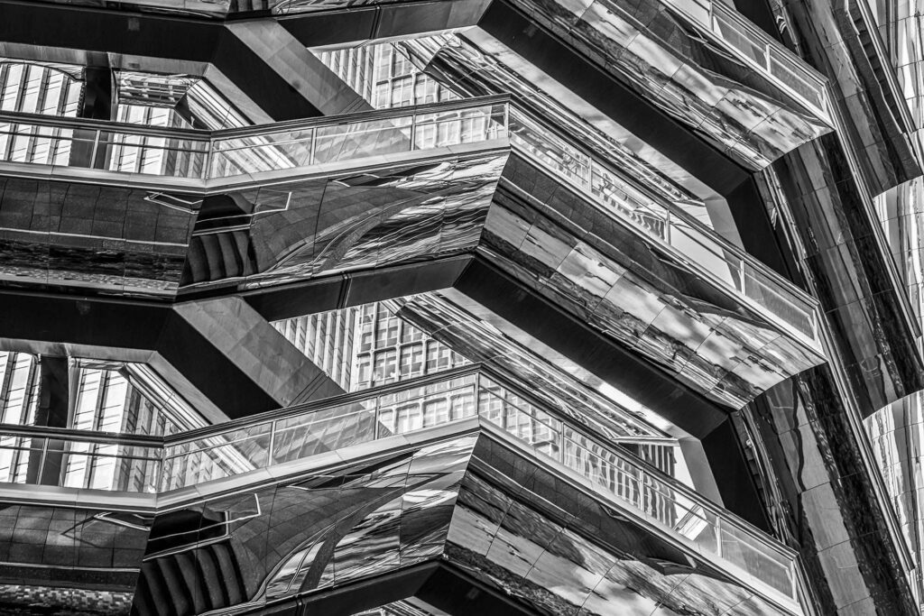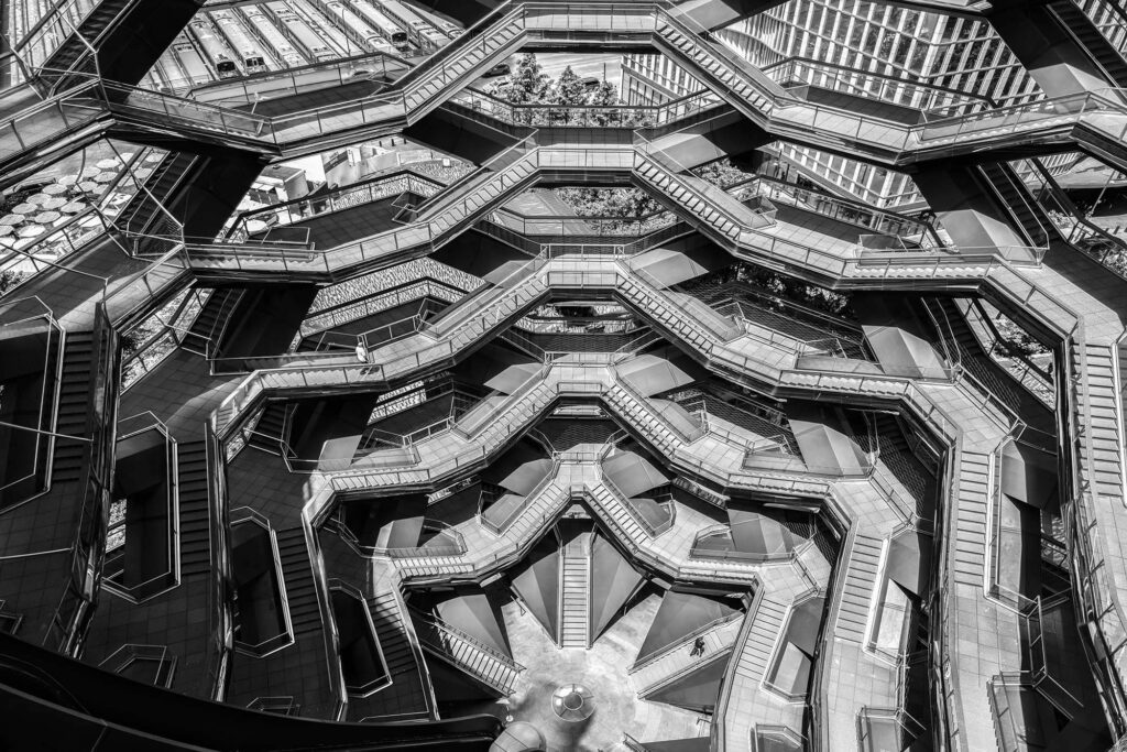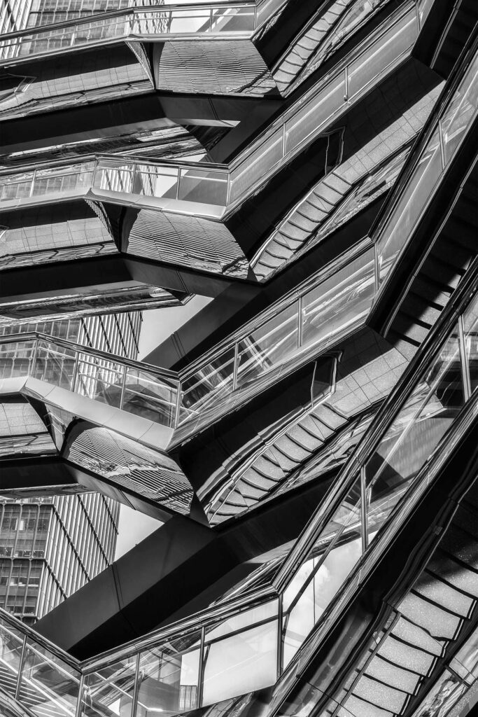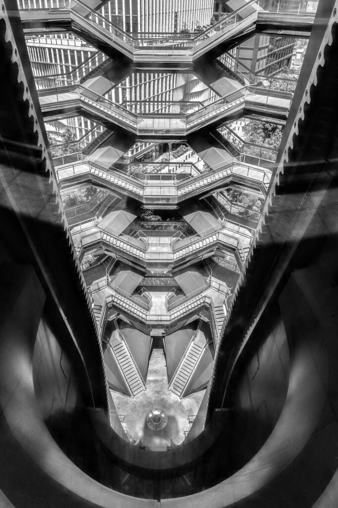 For J. L. Borges, the labyrinth was a metaphor for infinity, for choices, and for time itself. My new series, “The Escherian Labyrinths,” explores these same themes through the lens of architecture. Stripped of color, the staircases of The Vessel lose their utilitarian function and become a visual riddle. Like an Escher drawing or a Borges short story, the structure loops back on itself, trapping light in a cycle of repetition. These images are an invitation to get lost, not in a physical space, but in a geometry that challenges your perception of reality.