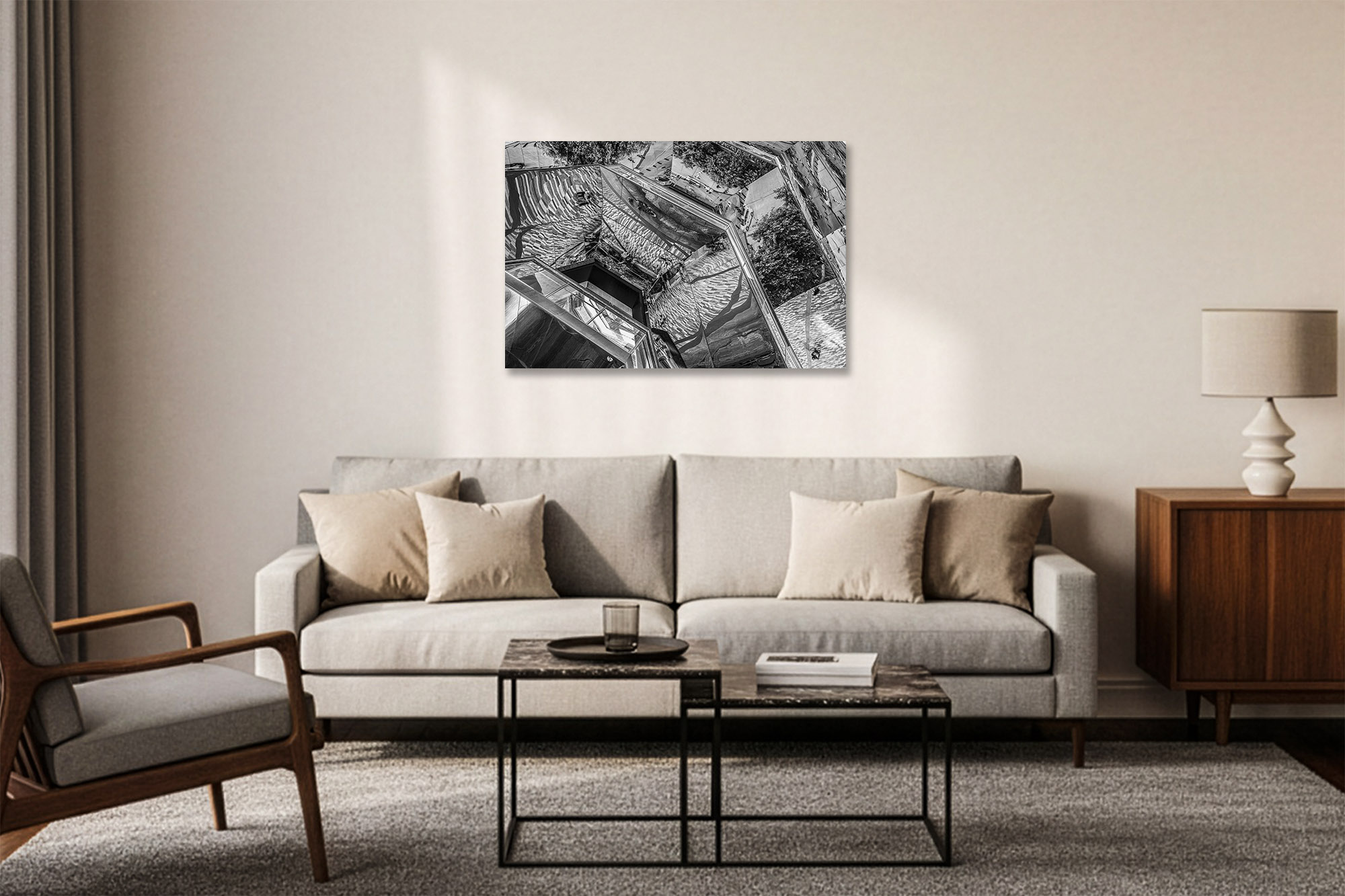 Each Fujiflex print is face-mounted to  1/4″ or 1/8″ Non-Glare Acrylic Face using an optically clear archival adhesive, then backed with a rigid DiBond panel. A Roma float mount system is affixed to the back, providing a sleek, ready-to-hang presentation using a French cleat.